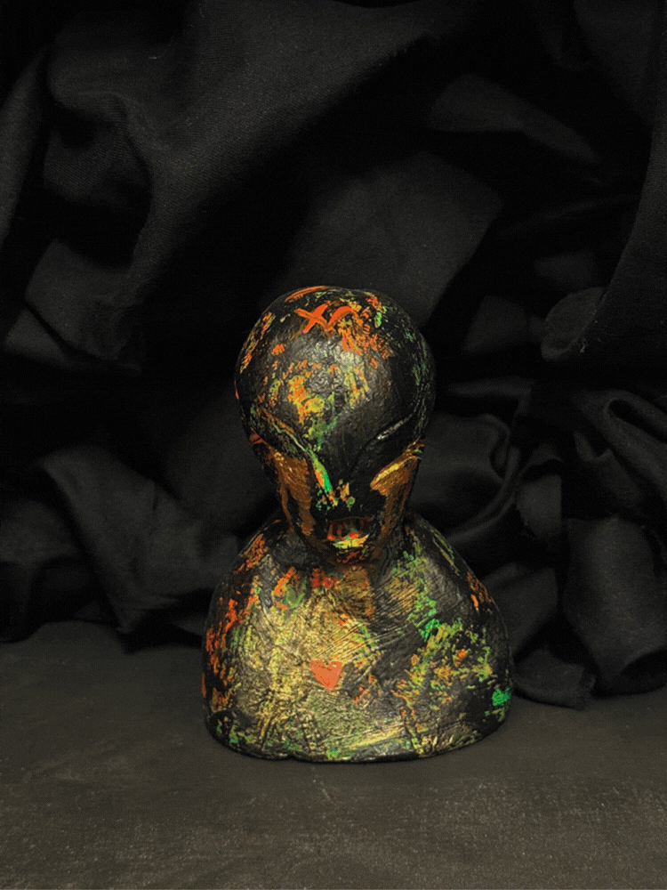 Accompanying this painting is a clay object titled “Mini Worship” – a miniature version of the universe. This entity, painted with fluorescent pigments that emerge through the dark surface, comes to life under UV light as an inner pulse – a reminder that the Universe, though silent, is still breathing, watching, and protecting.